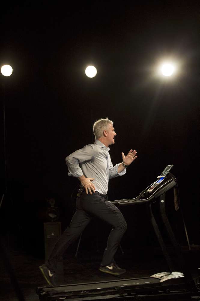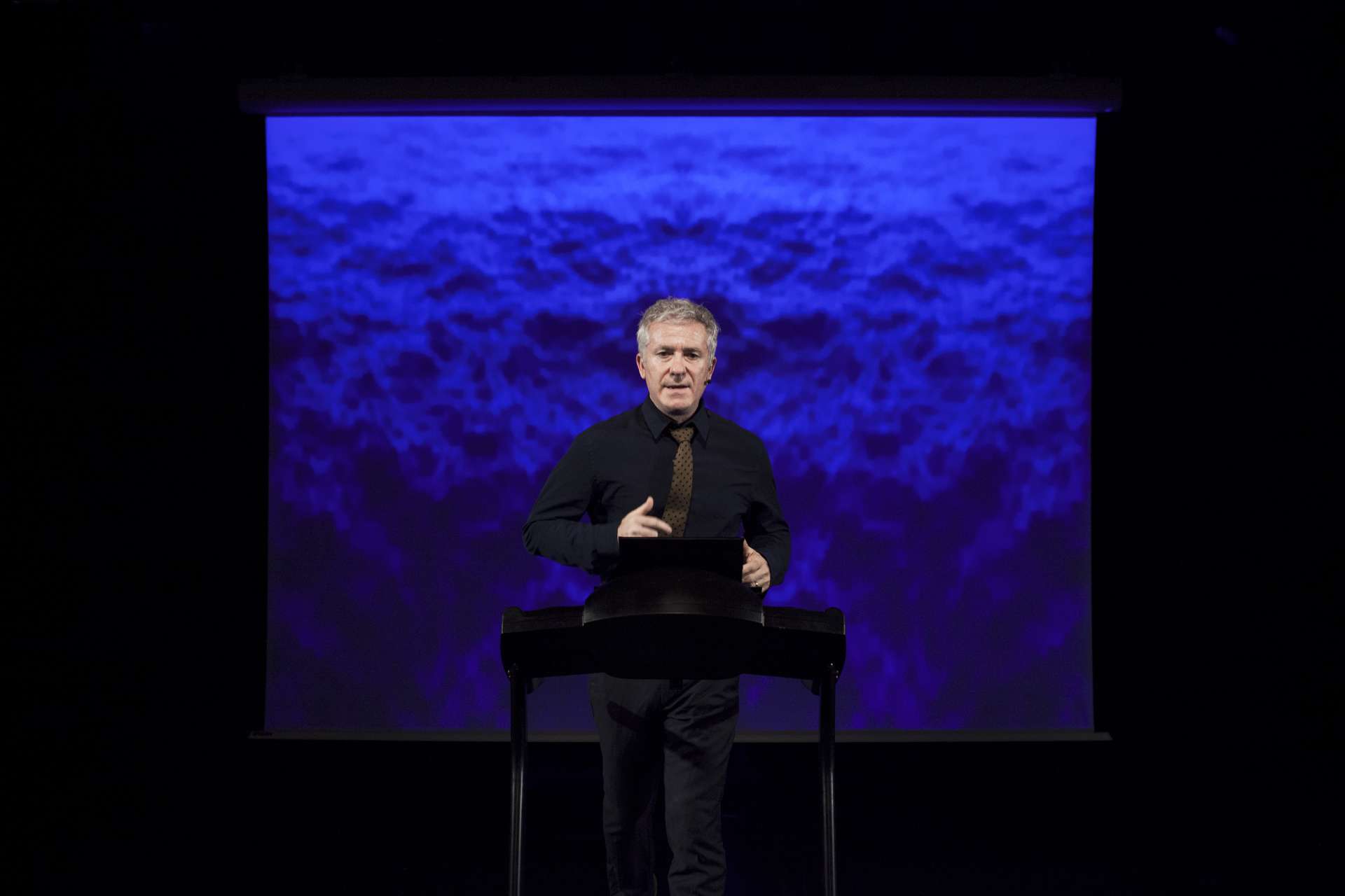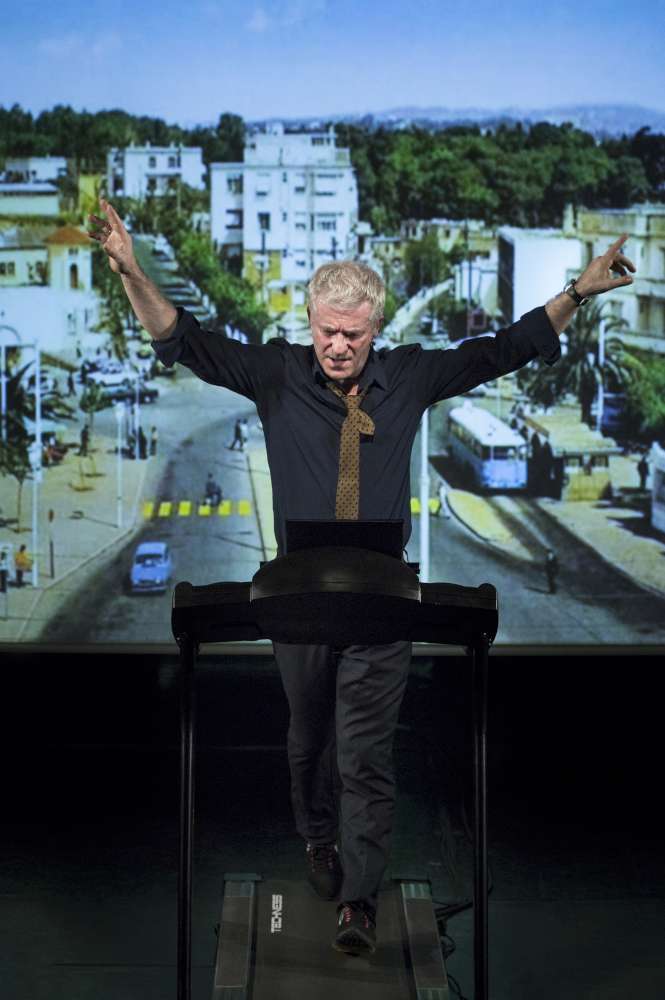 Alexis Moati se met physiquement en jeu avec ce texte qui part de son histoire intime pour faire écho à une histoire plus vaste. Il traverse ainsi, en coureur de fond immobile, les paysages de ses souvenirs, enfant d’une époque, qui une fois devenu adulte et lui-même père, porte un regard sur ce qui l’a façonné.