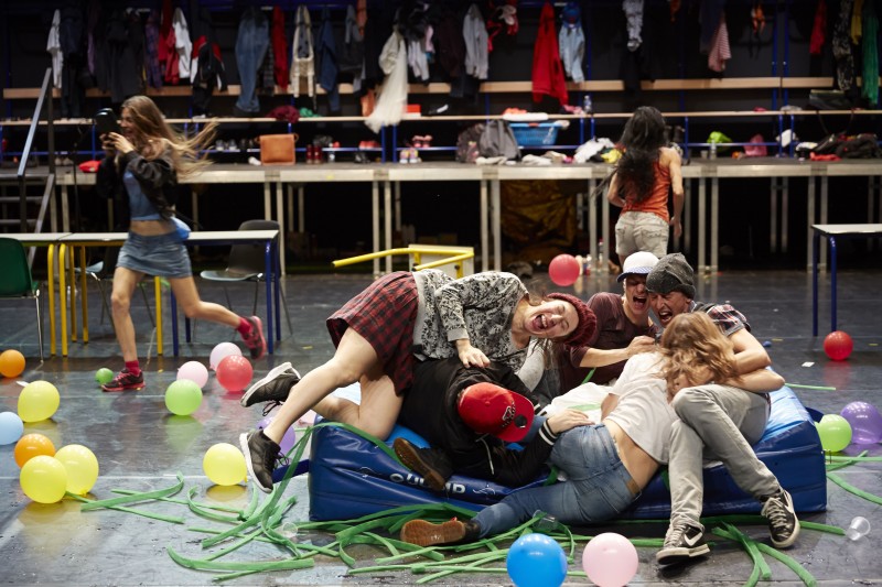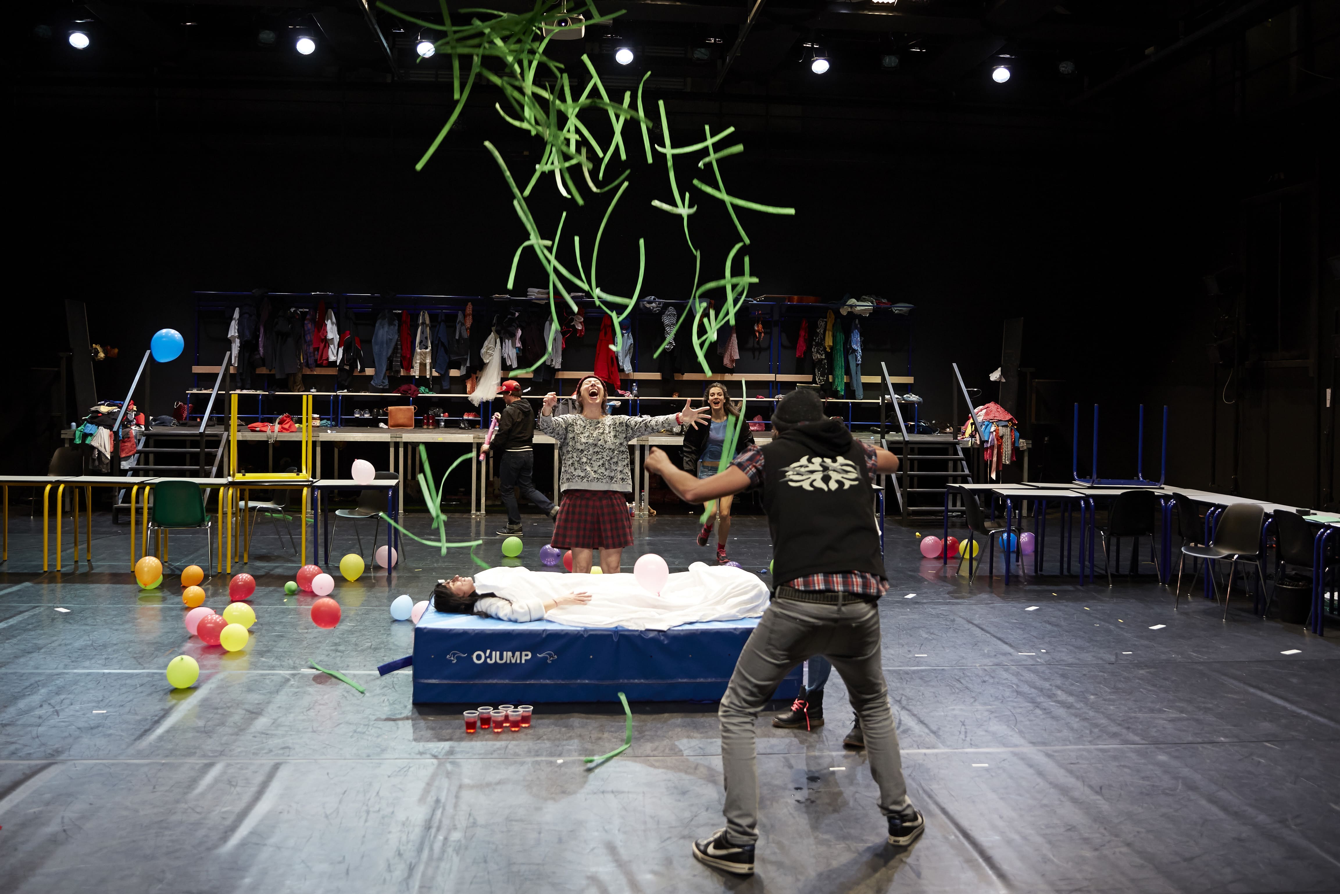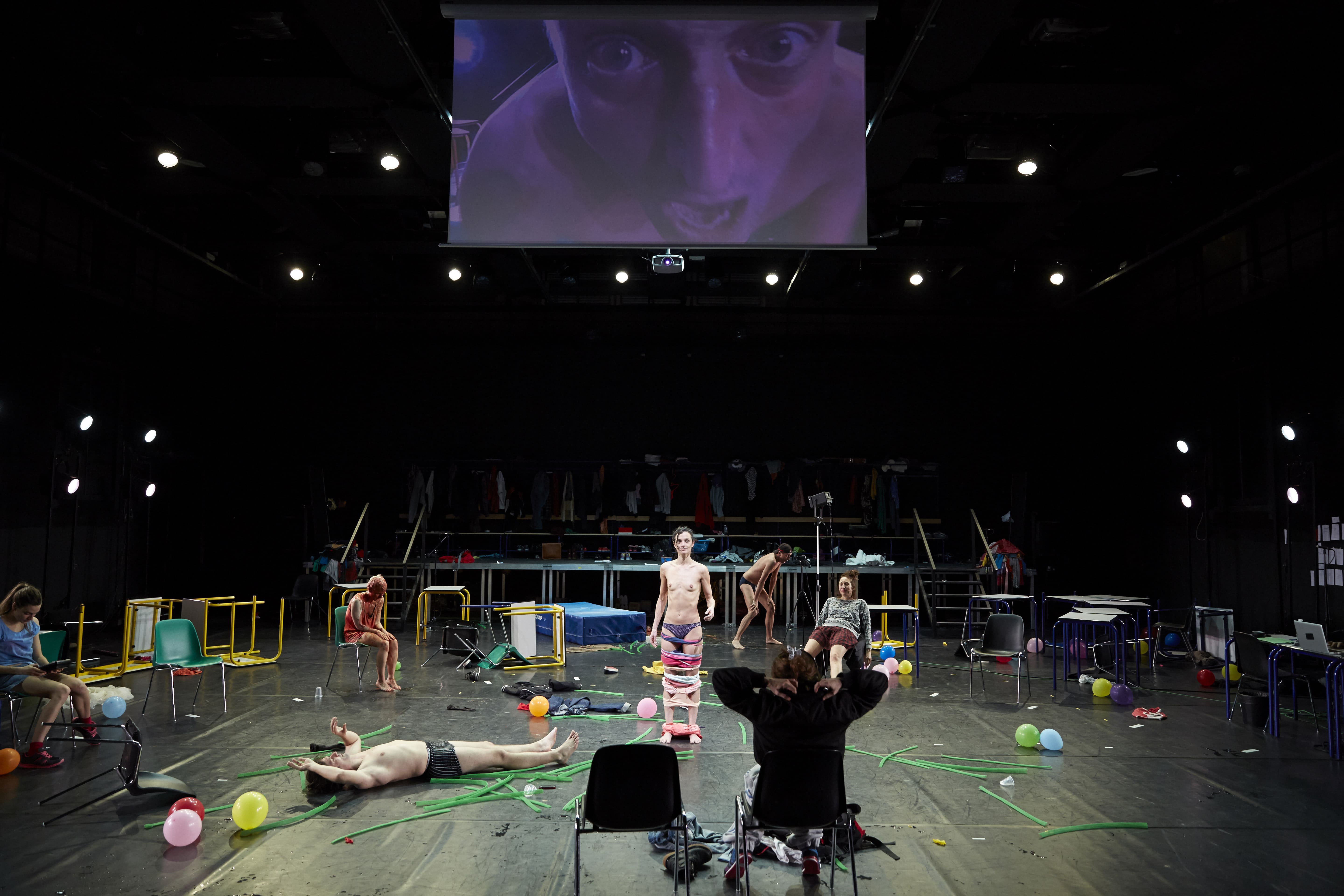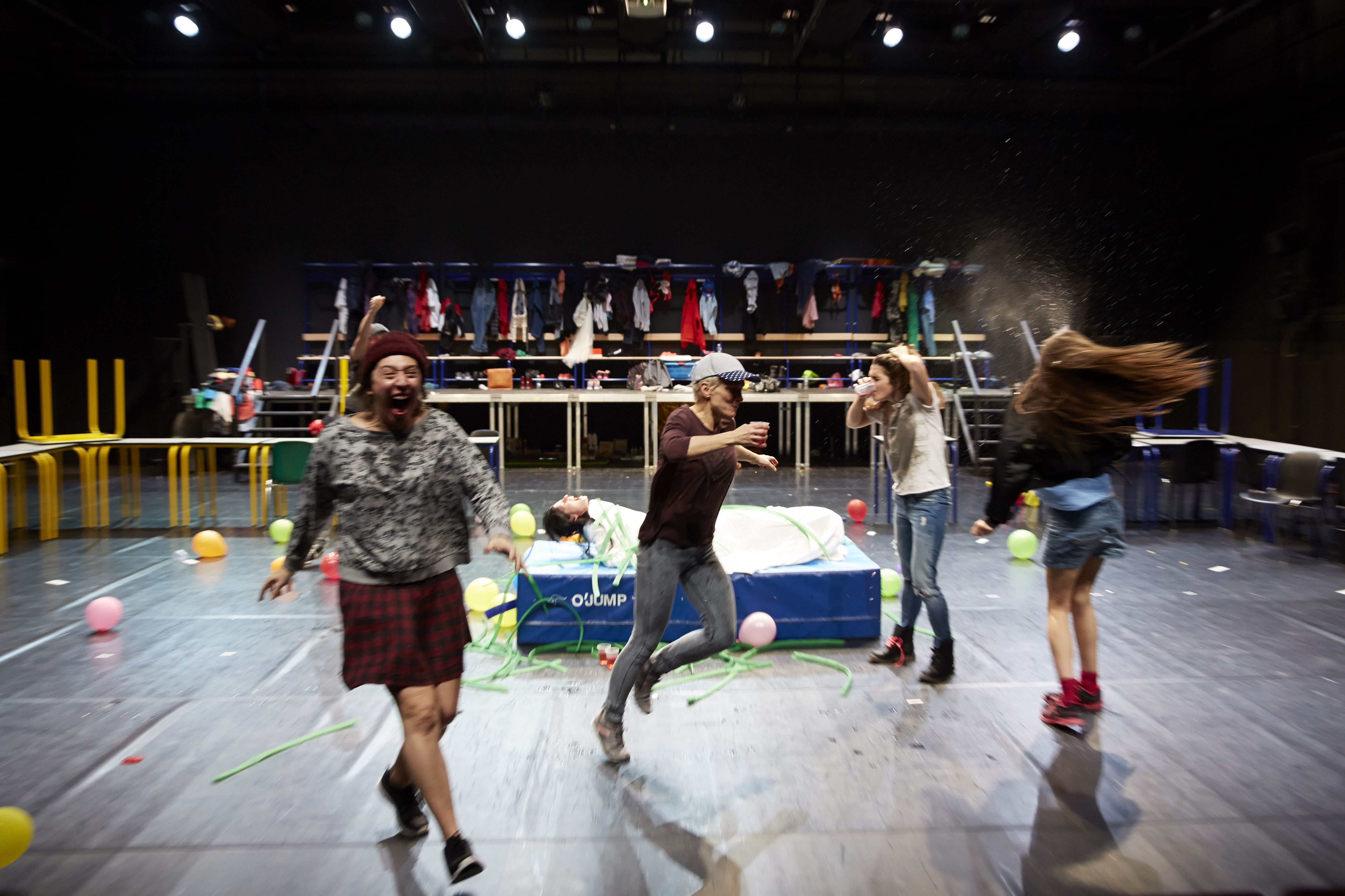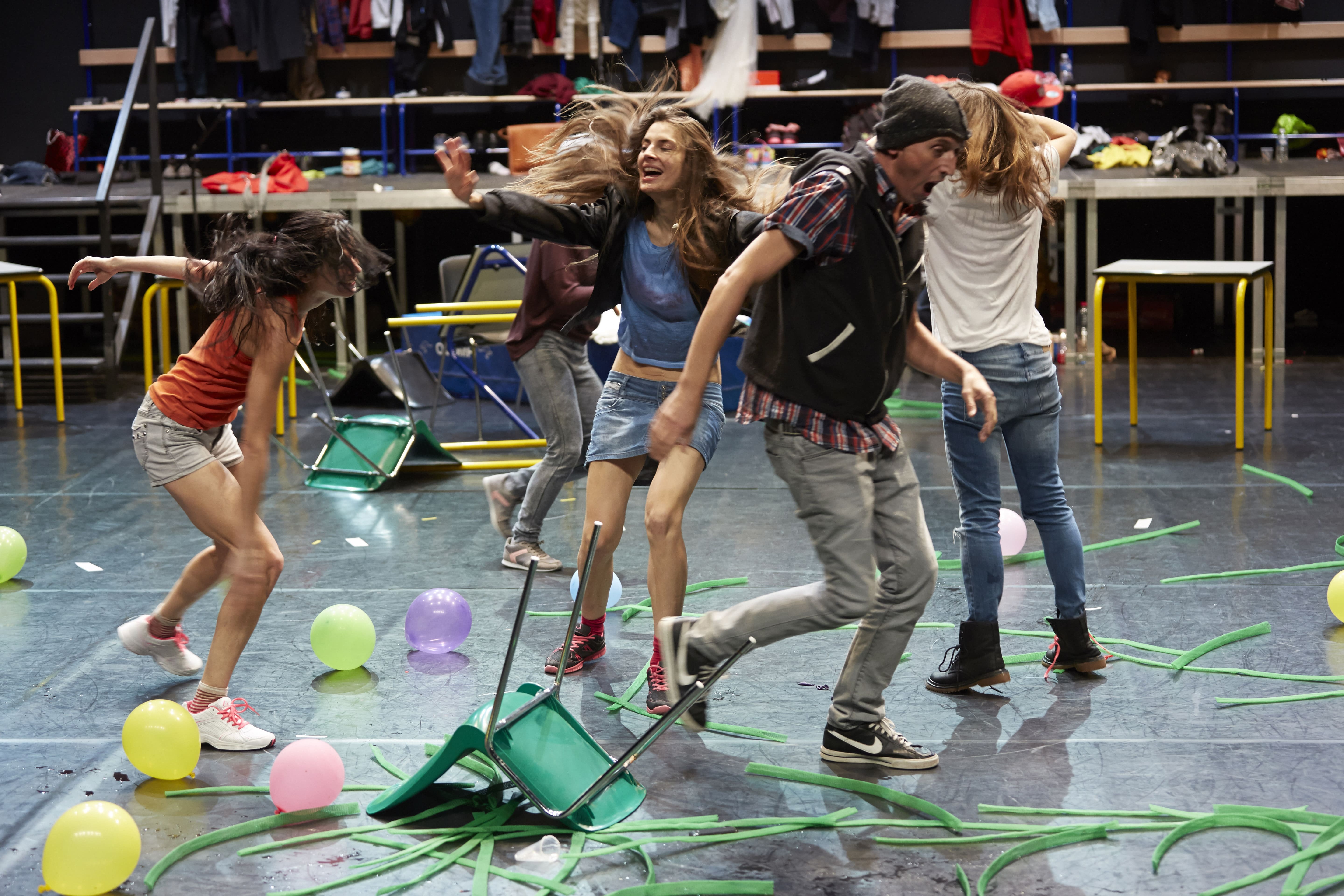 Sept acteurs (entre 26 et 46 ans) tour à tour adolescents, enfants, adultes, professeurs, parents... composent cette fable endiablée sur la transformation. Placés dans un dispositif qui met le corps en jeu (et non un décor), ils sont les constructeurs des univers successifs qu’ils traversent et restituent une vérité loin de toute psychologie. Comme des enfants qui jouent, ils font évoluer l’espace autour d’eux au gré de leur imaginaire.