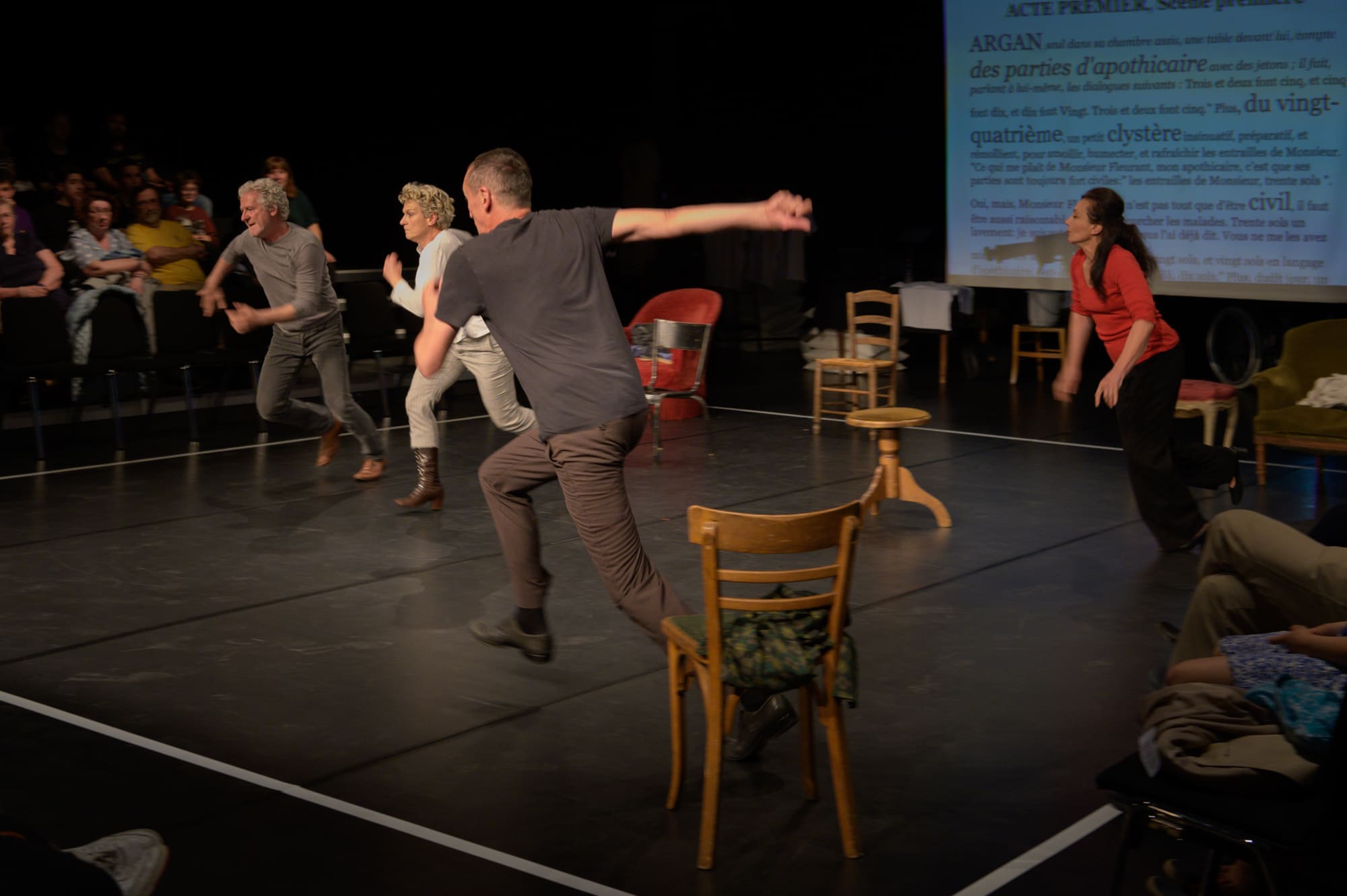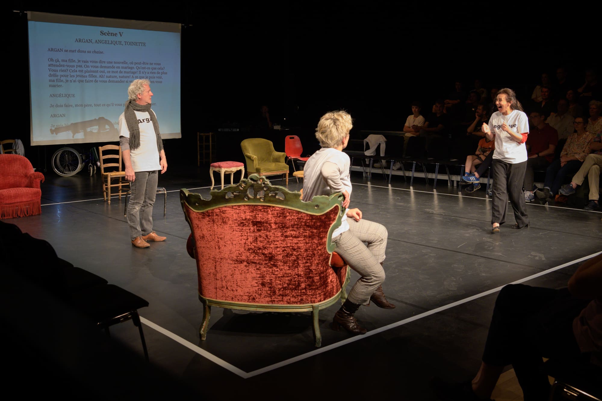 L’aventure du Malade Imaginaire est née d’une proposition du théâtre de la Calade à Arles, de travailler sur un texte classique. En même temps, nous avions entendu parler du projet d’Arpad Schilling en Hongrie de monter Hamlet avec trois acteurs interprétant toutes les figures, et pouvant se jouer partout. Il voulait renouer avec l’homme d’aujourd’hui, adresser cette parole aux jeunes gens, jouer dans les lycées. Nous avons eu envie de nous inspirer de ce projet. Impliquer le spectateur au cœur de notre dispositif. Jouer en permanence en interaction avec le public, pour qu’il construise le spectacle avec nous. Le solliciter au sens propre.